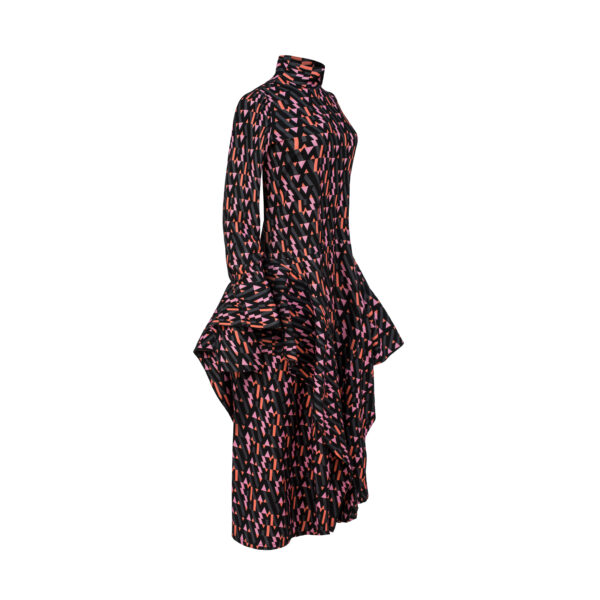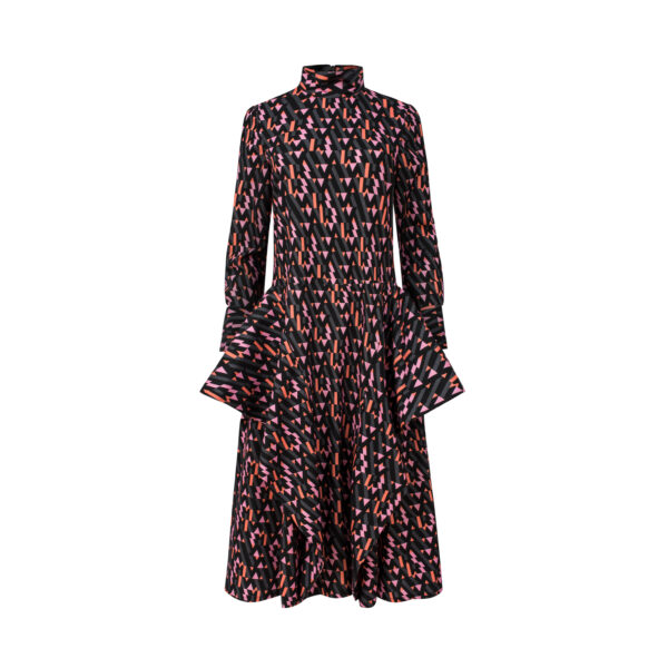 Long dress in the original pattern with stand-up collar,fancy cuffs and geometric inserts around the hips.